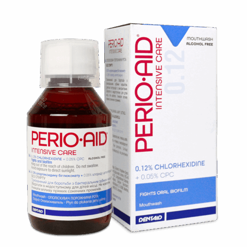 Ополіскувач PERIO-AID INTENSIVE CARE (ПЕРІО-ЕЙД ІНТЕНСИВНИЙ ДОГЛЯД) бореться з бактеріальним зубним нальотом у ротовій порожнині. Рекомендується застосовувати протягом 2-4 тижнів двічі на день для контролю патогенної пародонтальної мікрофлори. Містить хлоргексидин.